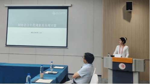 在分会场报告中,王洁分享了论文《网络语言失范现象及治理对策》。该研究以2018-2024年间的网络热词、热梗及流行语为主要语料,考察分析网络语言失范的典型表征,并据此提出构建以政府为主导的多主体治理体系。北京语言大学副研究员徐欣路、黄冈师范学院教授潘峰对报告内容进行点评,并提出了建设性意见。